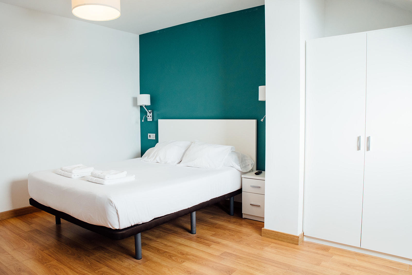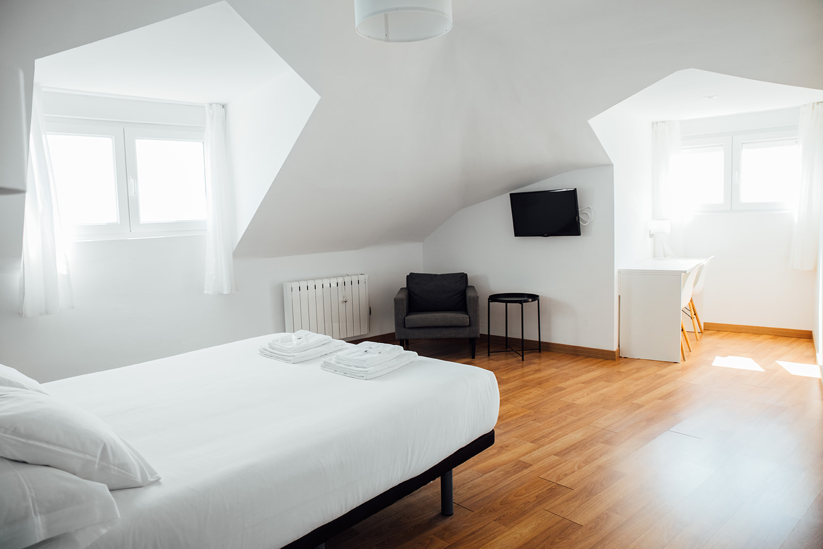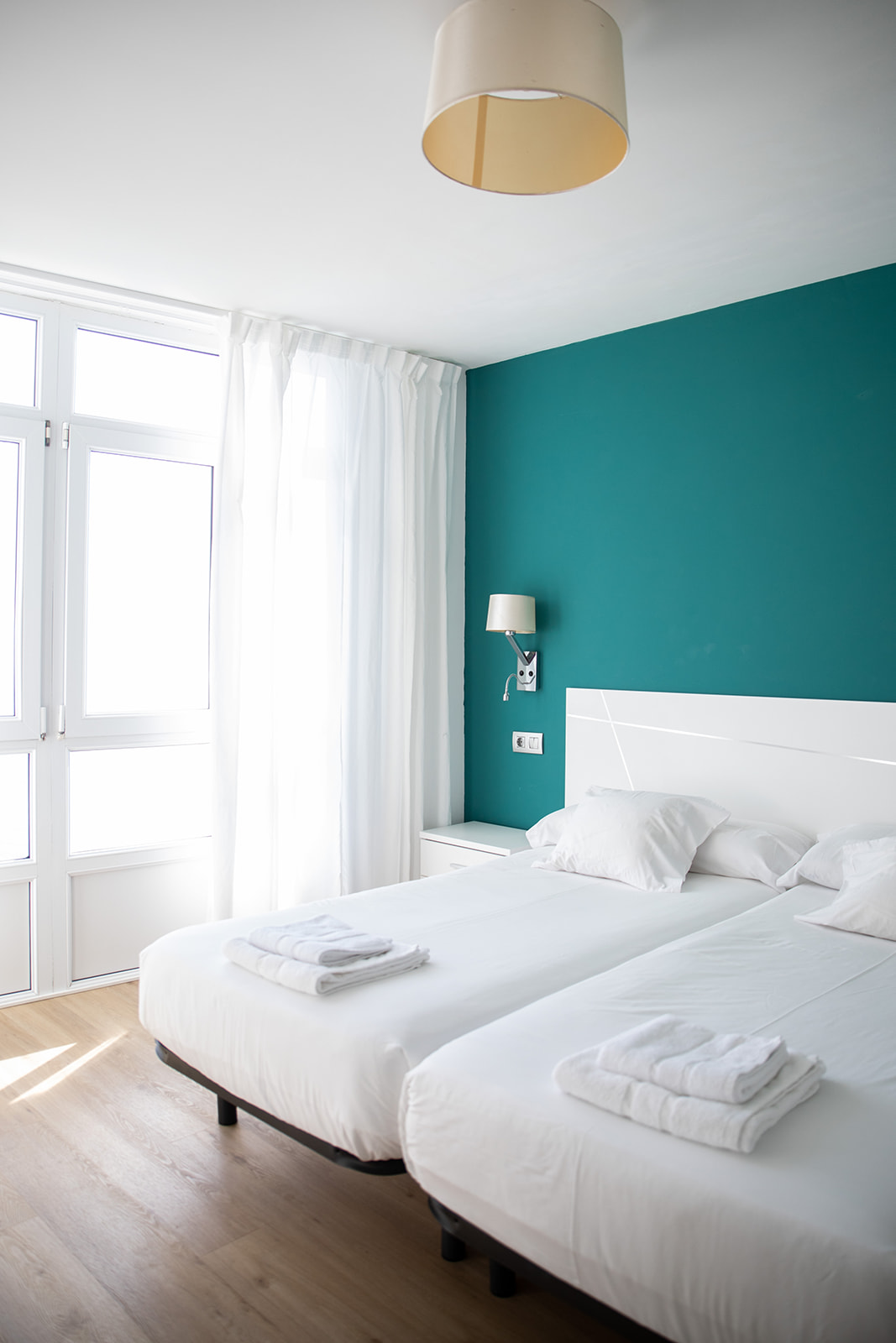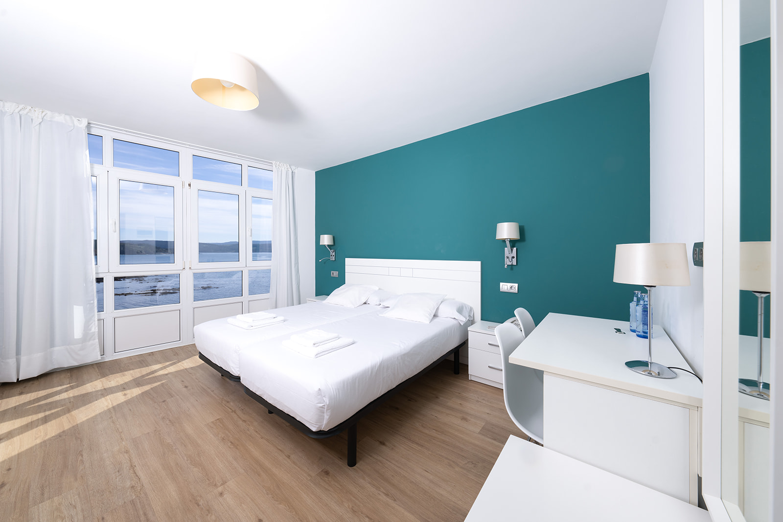 Habitación doble de 1 cama de 150 cm, con una superficie de 17 m² equipada con tv de 28", armario de dos puertas, escritorio con sillas y conexión a internet por Wifi, reposa maletas, y calefacción. Disponen de dos ventanas una con orientación a playa langosteira y otra hacia el puerto.