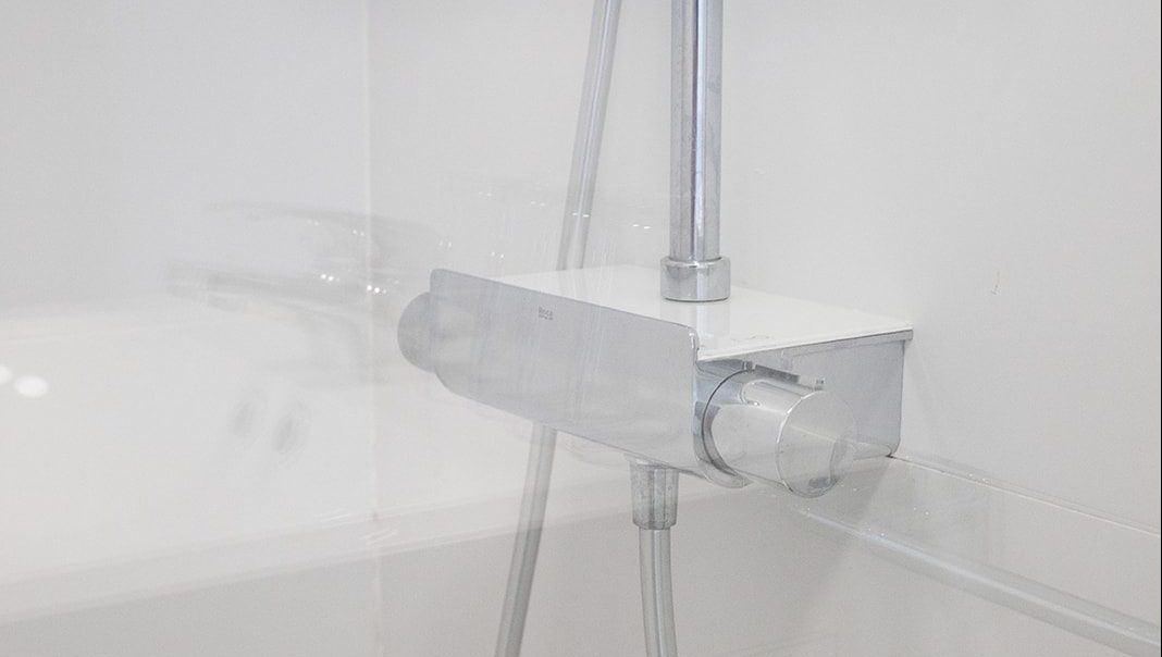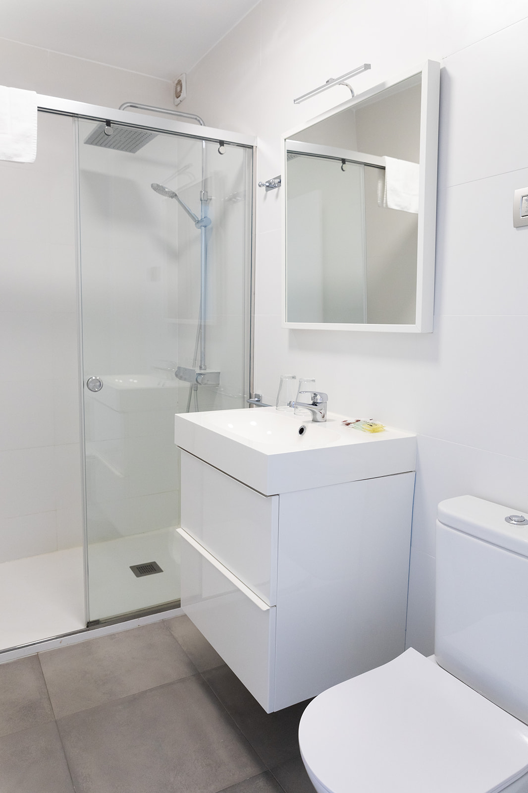 El baño cuenta con ducha termoestática, lavamanos doble y espejo con iluminación, secador de pelo con difusor y productos de acogida.