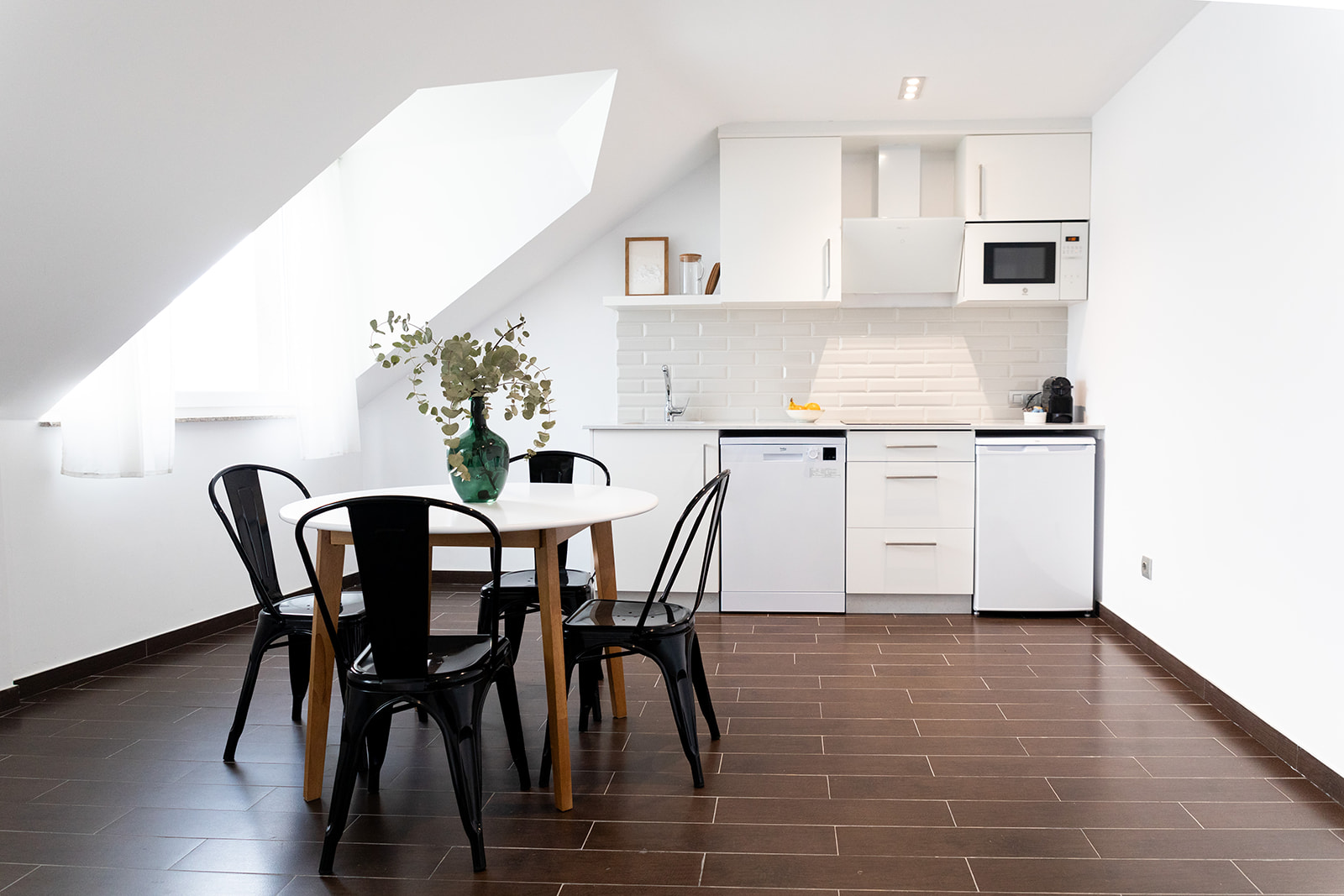 Cocina equipada con placa de inducción nevera bajo encimera, campana extractora, microondas, lavavajillas y cafetera tipo Nespresso mesa y 4 sillas y vajilla y utensilios de cocina.